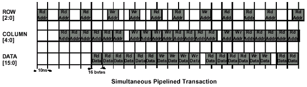 Каждая из команд шины управления может быть конвейеризирована, повышая тем самым ее эффективность использования. Команды ACT могут полностью абсорбировать (занимать) ROW-шину, генерируя небольшие 16-байтные произвольные передачи данных. Если рассматривать это с позиции соотношения размера самой передачи, то по мере увеличения размера передаваемого блока Activate, частота генерирования команд ACT должна пропорционально снижаться. Например, для полной загрузки шины данных достаточно постоянно посылать команды управления столбцами. Исключение составляют маленькие промежутки 1-4 такта синхросигнала, требующие выполнения цикла обращения шины между записью и чтением, что позволяет полностью утилизировать интерфейсы. Так, два цикла записи, следующие за двумя циклами чтения к одному и тому же устройству, дают в результате более 86% эффективности использования, а к нескольким микросхемам — до 95%.