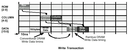Тайминги транзакции чтения и записи очень похожи, поскольку пакеты управления посылаются практически одинаково. Тем не менее, одна значительная разница между RDRAM и обычным DRAM заключается в задержке записываемых данных для выравнивания относительно таймингов передачи данных транзакции чтения. Данная задержка выбирается такой, чтобы максимально использовать полосу пропускания шины данных. В обычной SDRAM, когда команда чтения следует за командой записи, на шине данных возникает промежуток (Gap) между этими двумя операциями, который по длительности эквивалентен задержке чтения из устройства. Если, к примеру, 100MHz микросхема SDRAM имеет задержку чтения 3T (три такта системной шины), то необходим 30ns интервал между окончанием фазы записи и началом цикла чтения. RDRAM свободна от данного интервала, поскольку просто посылает данные позднее, после чего фактически выполняется последовательность записи. Команда записи по COL-шине указывает микросхеме какие именно данные будут записаны в устройство позднее, через четко определенный интервал — обычно эти данные записываются в массив так скоро, как будут приняты. Используя как опцию для задержки записи этих данных, можно разрешать команде чтения опережать (так называемый цикл «Go Around») запись, уменьшая эффективную задержку чтения, которая обычно довольно критична. Тем не менее, основная масса записываемых данных обычно буферизируется и не является чувствительной к задержке. Если алгоритм контроллера выбрал этот режим, то проверки одного единственного адреса будет более чем достаточно, чтобы точно определить соответствие команды чтения не полностью записанным данным. В этом случае чтение может быть задержано определенно установленный временной интервал, или данные просто могут быть возвращены в пределах внутренних схем контроллера инициатору запроса, экономя полосу пропускания канала на выполнении такой тривиальной транзакции.