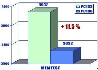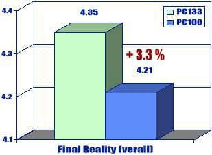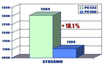 Теперь, что касается скорости PC133. Сравним для начала ее с PC100 SDRAM. Вот результаты тестов, сделанных VIA на следующей конфигурации: PII 400, 256 Мб DRAM, TNT2 с 32 Мб.