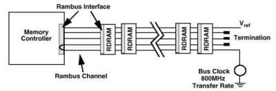 Технология Direct RDRAM состоит из трех функциональных частей: Rambus Interface, Rambus Channel, и, собственно, чипы RDRAM. Rambus Interface реализован как в чипах RDRAM, так и в связующем их Rambus Channel. Выглядит это все примерно так: