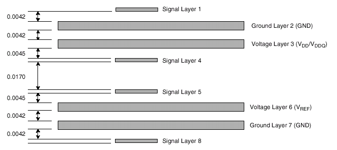 Габаритные размеры PCB DDR SDRAM Registered DIMM полностью соответствуют типоразмерам Registered DIMM, приводимым ранее. Топологическая схема предусматривает соответствие материала печатной платы требованиям UL-94V-0, задержку распространения по внутренним слоям (Soi) 2.0-2.2 нс/фут, задержку распространения по внешним слоям (Sou) 1.6-2.2 нс/фут, полное сопротивление трассы (Zo) 54-66 Ом и восьмислойную схему 4/6 mil типа S-G-P-S-S-P-G-S.