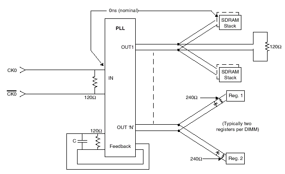 Задержка подачи управляющих синхросигналов к микросхемам памяти на модуле оптимизирована для высокоскоростных операций на уровне топологии и трассировки печатной платы. Полная задержка поступления синхросигнала складывается из времени задержки распространения от интерфейса модуля до входных выводов микросхемы PLL, времени задержки распространения по сигнальной трассе от микросхемы ФАПЧ до микросхемы SDRAM и задержки "pin-pin" на пассивных компонентах типа серий резисторов. Эта суммарная задержка рассчитывается и моделируется непосредственно производителем модуля согласно общей спецификации и требованиям к тайминговой программе конкретной сигнальной группы. Иными словами, предлагается конкретная базовая модель с точно рассчитанными параметрами (Reference Net, например, в случае DDR SDRAM Registered DIMM семь модификаций — A, B, C, E, F, H и K), имеющая конкретную топологию, изменяя которую добиваются оптимизации согласования по таймингам и маршрута сигналов, однако установленные временные и нагрузочные параметры остаются постоянными.