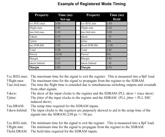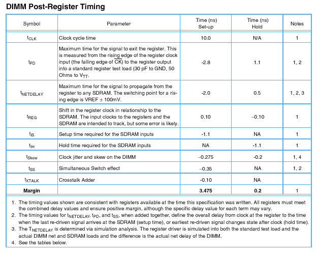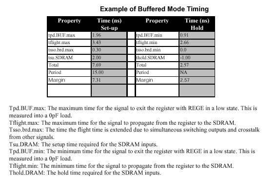 Умышленно вводимый запас времени (Margin) для режима Buffered получается из тайминговых параметров режима Registered. Для полностью завершенных систем с высоким уровнем анализа таймингов, разработчик должен складывать/вычитать с/из этим запасом времени другие параметры. К последним относятся: время распространения сигнала от контроллера памяти до разъема DIMM (tSF — System to DIMM Flight Time), перекос сигнала (Clock Skew), случайные выбросы (Clock Jitter), синхронизация внешнего регистра с задержкой на выходе (External Register Clock to Output Delay) и т.д. Тайминги в режиме Registered крайне критичны, а в режиме Buffered представляются на основе анализа таймингов режима Registered.