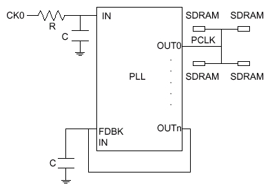 Общее правило распределения нагрузки на выходах микросхемы PLL такое: четыре микросхемы SDRAM на один выход OUTх микросхемы ФАПЧ (сигнал PCLK). Последний выход OUTn остается зарезервированным для создания петли обратной связи, назначение которой описывалось ранее, со входом FDBK (FeeDBacK) микросхемы фазовой автоподстройки частоты.
