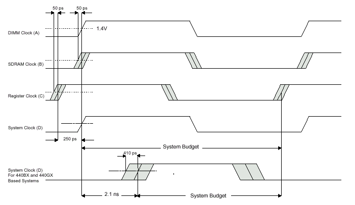Поэтому, протокол синхросигналов SDRAM Registered DIMM одной тактовой частоты и линией опорного напряжения (VREF = 1.4V) выглядит следующим образом. После коммутации, синхросигнал появляется на микросхемах Register, затем, после задержки в 250 пс, синхросигналы от системного тактового генератора появляются одновременно (с сигналом с PLL) на DIMM и входах микросхем SDRAM, а еще через 2140 пс синхросигнал появляется на входе контроллера памяти базовой логики. Здесь нужно учесть, что для тактовых сигналов системы (вход PCLKIN), микросхем SDRAM, Register и PLL опорным является передний фронт импульса синхросигнала на входе микросхемы ФАПЧ. Все умышленные задержки и выравнивание фазы контролируются емкостями и/или длинами сигнальных трасс.