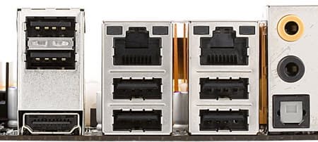 Удобство горизонтально расположенных портов для накопителей не вызывает сомнения, и очень радует, что таким образом стали располагать порты SATA даже не на самых дорогих платах. Среди рассматриваемых плат такое расположение портов не получили лишь модели от Gigabyte (что особенно странно, учитывая в остальном прогрессивную конструкцию) и ECS.