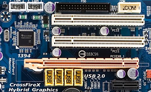 Поддержка CrossFire, в отличие от некоторых дешевых плат на чипсетах, официально не поддерживающих более одного графического порта, реализована на рассмотренных платах основательно, между графическими портами оставлено двойное расстояние, что позволяет установить две карты с двухслотовой системой охлаждения, оставив зазор для нормальной вентиляции обеих карт. А в хвостовой части этих портов нет высоких эелементов на плате и портов, подключение шлейфов к которым могло бы быть затруднено вследствие установки громоздких видеокарт. Любопытно, что один из производителей — ASUS счел возможным установить на свою плату даже три порта PCI Express x16 (дополнительные порты у всех плат также могут быть задействованы не только для видеокарт, но и для установки карт расширения с меньшим количеством линий PCI Express).