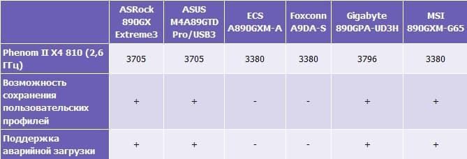 Если обратить внимание на максимальную частоту, оказывается, что платы довольно неожиданно сгруппировались в три группы, причем внутри групп результат оказалася одинаков с точностью до мегагерца (опорная частота при разгоне нашего Phenom II X4 810 была установлена на уровне 285 МГц у ASRock и ASUS, и 260 МГц — в группе аутсайдеров в составе плат от ECS, Foxconn и MSI, дальнейшее повышение сразу же приводило к синему экрану и остановке в загрузке Windows 7 x64). Но сама расстановка плат по разгонным способностям предсказуема, например, платы от ECS и Foxconn по всем признакам на оверклокеров не рассчитаны. Лишь относительно низкий результат платы от MSI оказался неожиданным, поскольку позиционируется она как продвинутая mATX, в том числе, и в части разгонных возможностей.
