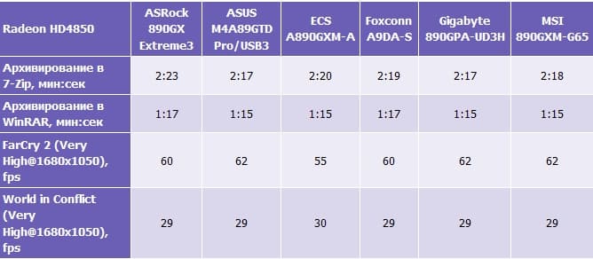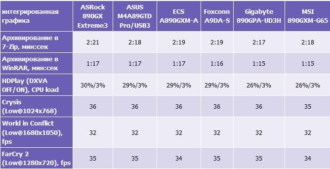 Поскольку все платы оснащены видеобуферами и по умолчанию все компоненты работают на штатных частотах (в тестах мы фиксируем опорную частоту, а также основные тайминги памяти), отличий в производительности практически нет. Формально можно отметить лишь чуть худший результат платы ASRock, но разница прослеживается лишь в наиболее чувствительном архиваторе и тесте декодирования видео.
