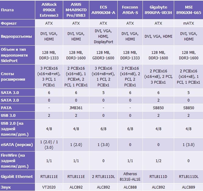 Как и следовало ожидать, выпуск чипсета AMD 890GX, являющегося эволюционным обновлением, вызвал столь же эволюционное пополнение в ряду системных плат от всех основных производителей. Собирательный портрет такой платы выглядит довольно привлекательно: это хорошо оснащенная для сборки среднебюджетного компьютера полноразмерная ATX-модель с парой графических портов, поддержкой SATA 3.0, не обязательным, но также распространенным USB 3.0-контроллером. Впрочем, как продемонстрировал пример платы MSI, ту же функциональность можно уместить и в формате mATX. Максимально скромно оснащенной выглядит плата от Foxconn, но зато она и наиболее экономичная, как по энергетическим аппетитам, так и по стоимости. А выбрать однозначного лидера по богатству комплектации не получится и справедливо будет разделить это звание между моделями от ASRock и ECS, первая может похвастать USB 3.0 контроллером, двумя eSATA и FireWire, тогда как у второй в наличии полный комплект существующих цифровых видеовыходов и два сетевых порта. Комплектация платы от ASUS не имеет каких-то экзотических особенностей, но, пожалуй, именно она наиболее соответствует предпочтениям среднестатистических пользователей, и сама плата справедливо претендует на массовый спрос. Наконец, Gigabyte лучше остальных подойдет для сборки мощной игровой конфигурации с неплохими перспективами для разгона процессора.