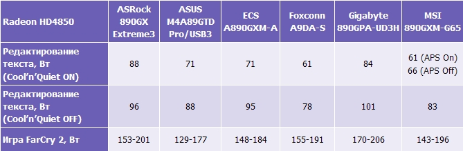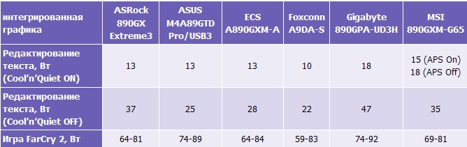 Значение потребляемой мощности измеряно встроенным в блок питания ваттметром для системы в целом, использовался процессор Phenom II X4 810.