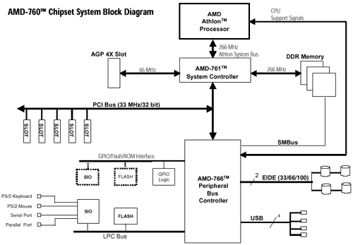 И последний штрих — в отличие от других DDR-чипсетов, например, Ali MAGiK 1 или VIA Apollo Pro266, AMD-760 поддерживает только DDR память.