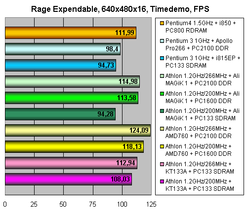 Игра Expendable, также использующая API Direct3D, вообще ставит все с ног на голову. Специально оптимизированная под 3DNow!, Expendable даже не стесняется демонстрировать это при загрузке, что обуславливает подавляющее преимущество процессора Athlon. Нагрузка на память тоже хоть куда — кстати, именно в Expendable системе на Pentium III с DDR памятью на Apollo Pro266 удалось обойти i815 c SDRAM.
