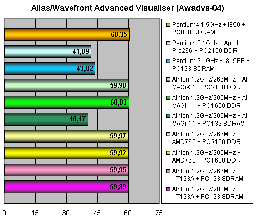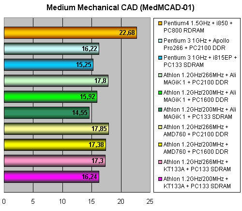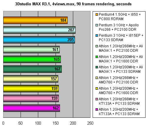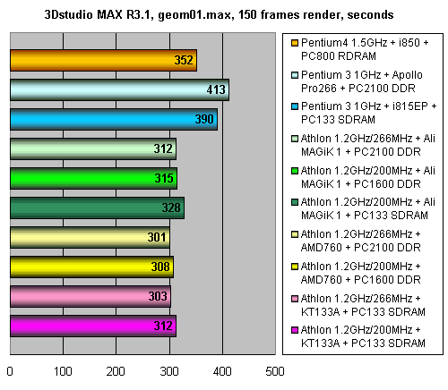 Для профессионального применения в системах 3D моделирования Pentium 4 подходит как нельзя лучше, более того, по мере оптимизации под SSE2 и увеличении тактовых частот он проявит себя еще лучше. Но работяга Athlon старается не отставать и практически наступает на пятки своему конкуренту. При этом прирост от использования DDR памяти и 266МГц шины весьма незначителен, основываясь на результатах чипсетов от AMD и VIA, зато волшебный Magik 1 демонстрирует обратное. Кстати, это практически единственный тест, где проявляется превосходство DDR памяти над SDR для процессора Pentium III. Надеемся, что по мере оптимизации драйверов и BIOS чипсет Apollo Pro266 все же проявит себя с лучшей стороны и окажется востребованным не только за свою широчайшую функциональность, но и за достойную производительность — хотя бы процентов на пять больше, чем у i815EP.