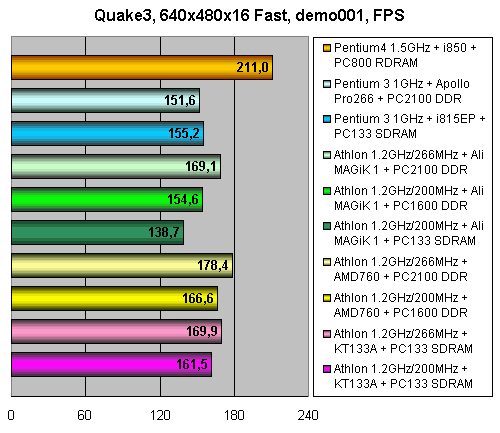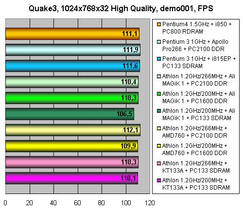 Сопроцессор CPU рассчитывает освещенность каждой вершины (lightning), При этом существенную роль играет оптимизация драйверов и приложения под наборы инструкций 3DNow! и SSE, по сути являющихся расширителями возможностей сопроцессора. Начнем с Quake 3, как широко применяемоего игрового бенчмарка. Хотя Quake 3 плохой пример, т.к. он не делает освещение и single-skin через HW T&L, поэтому даже на GeForce 256 получается 100-120 fps в 1280х1024, в то время как в Q2 получается около 300 fps, но, других, более приемлемых и распространенных для использования в качестве теста OpenGL игр у нас нет.