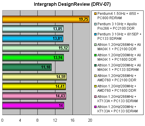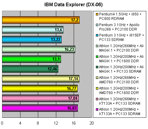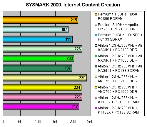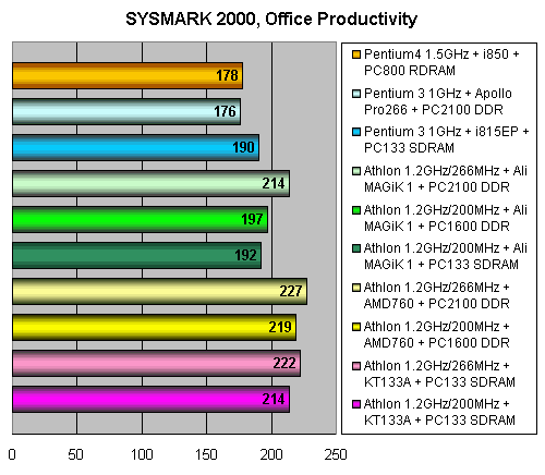 Переход на 266 шину и/или DDR память влечет за собой примерно одинаковый прирост производительности для наборов офисных приложений, причем характерно, что прирост для системы на базе чипсета Ali Magik 1 намного более сильный, нежели для систем на базе AMD-760 или KT-133A. Придется еще поработать над драйверами и BIOS. Хорошо, если не над контроллером памяти и системной шины…
