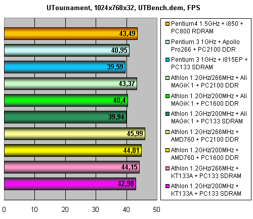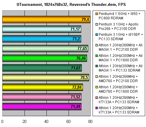 В Unreal Tournament нагрузка на шину "процессор-память" оказывается еще более серьезной, чем в Quake3, например, за счет применения палитровых текстур и процедурных текстур (генерируемые и пересылаемые в карту на каждый кадр) — в результате всего этого картина с производительностью существенно меняется. Ну и в отличие от Quake3, под UT перестали оптимизировать драйверы. На более простом тесте Thunder определяющим фактором является пропускная способность системной памяти, которая выводит в лидеры Pentium 4 и Athlon на 266 МГц шине с DDR памятью на обоих чипсетах — AMD-760 и ALi Magik 1.