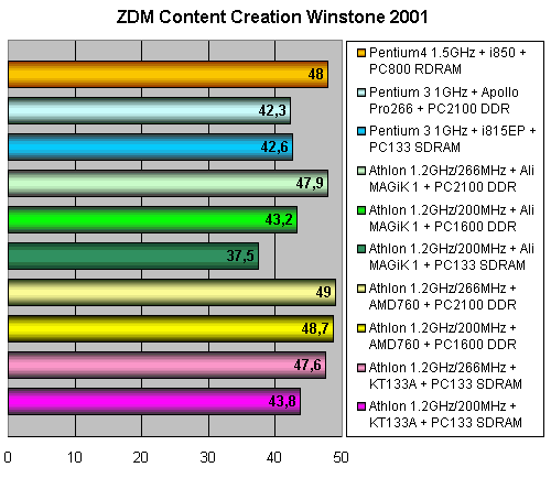 Здесь Pentium 4 выглядит фаворитом — у него есть все перечисленное и он без труда обходит конкурентов. За счет SSE выезжает и Pentium III — если бы не разница в 200 МГц с процессором Athlon в пользу последнего, то он бы, пожалуй, смог даже обойти его на SDRAM платформе — KT133A.