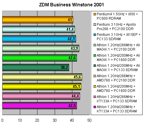 Тесты Ziff-Davis Media (ZDM) Business Winstone 2001 и Content Creation Winstone 2001 как нельзя лучше дополняют тест SYSMARK 2000 — они располагают похожим набором приложений с поправкой на 2001 год, и запускают все приложения одновременно, переключаясь между ними и передавая результаты своей работы друг другу. В итоге получается усложненная (для полноценной загрузки системы) модель практически реального процесса создания документов или контента. При этом хронометрируется общее время работы каждого из тестов и выдается финальный результат в баллах — чем больше, тем лучше.