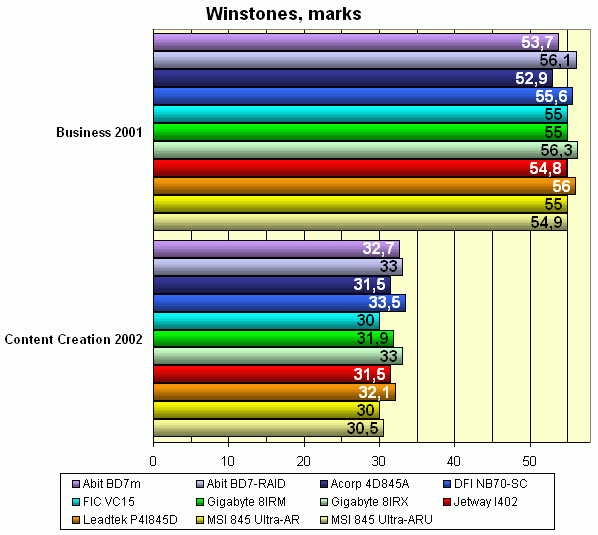 Результаты Winstones традиционно оживляют картину, но мы бы поостереглись делать какие-либо выводы на основании этих тестов. А вот в SYSmark все гораздо однозначнее, там выделиться удается только разогнанной плате от DFI.