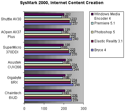 В первом из тестов — игровом (Quake III — OpenGL и Rage Expendable — Direct3D), платы разделились на две группы. Первая, в которую входят Gigabyte 6RX, ASUS CUV266 и Chaintech 6VJD, показала наивысшую производительность, во второй же оказались AOpen AX37 Pro, Shuttle AV30 и SuperMicro 370DDI, показавшие примерно одинаковые (меньшие) результаты. С чем связано такое разделение — сказать не возьмемся, возможно дело в BIOS. Следует заметить, что с течением времени все может поменяться — платы еще не дошли до серийного производства, и в компаниях идут отладочные работы.