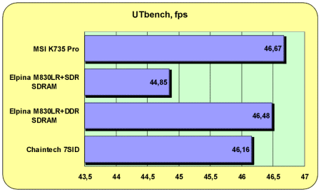 Итак, в 3DStudio MAX расстановка сил не изменилась — на первом месте MSI K735 Pro, на последнем — Elpina M830LR+DDR RAM. Про SDRAM уже речь не ведется — ситуация абсолютно ясна. Плохо. Вопрос только в том, на сколько плохо?