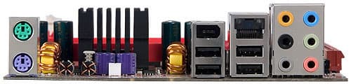 На обычном месте разъемов COM и LPT нет вообще ничего, так как дизайн делался, очевидно, под интегрированный чипсет (Xpress 200). Зато вследствие этого будет хорошо охлаждаться блок процессорного преобразователя напряжения, так как воздух от кулера на процессоре (конечно, в случае обычного воздушного кулера, а не СВО) будет проходить через соответствующий радиатор и удаляться через отверстие в задней панели (особенно если не использовать комплектную заглушку).