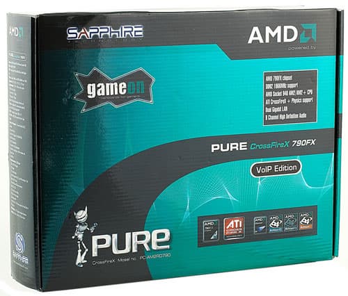 Фанаты компании Intel, последовательно придерживающиеся комплектующих от этого производителя, с давних пор имеют возможность выбрать и процессор, и чипсет, и плату на нем, все под одной маркой. Столь же последовательные поклонники компании AMD, с одной стороны, могут выбрать не только процессор с чипсетом, но и видеокарту на графическом процессоре AMD. А поскольку современные видеокарты, особенно дорогие, имеют референсный дизайн, и преимущественно производятся на нескольких фабриках по заказу самой AMD, и лишь потом раздаются компаниям-партнерам для упаковки и реализации, можно считать, что и в целом видеокарта произведена AMD. С другой стороны, как быть с платой? Чипсеты от AMD весьма хороши, и даже не нужно быть фанатом, чтобы сделать выбор в пользу современной линейки во главе с 790FX. А чтобы и марка платы была соответствующей, наверное, логично обратить внимание на продукцию эксклюзивных производителей (таких как Sapphire), выпускающих исключительно карты и платы на чипах AMD. Тем более что и Intel, как известно, платы делает не сама, а лишь разрабатывает дизайн и заказывает производство у Foxconn и ECS, а производителей плат, которые бы делали платы эксклюзивно на чипсетах Intel, не существует. Sapphire, тем временем, постаралась и с упаковкой, выбрав фирменную палитру AMD и поместив большой логотип.