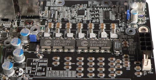 Система охлаждения состоит из большого радиатора, охлаждающего стабилизатор напряжения, и пары компактных радиаторов на мостах чипсета. Разумеется, как и у всех дорогих плат, радиаторы соединены тепловыми трубками. В данном случае оригинальной особенностью является то, что основной радиатор охлаждается за счет конвекции, создаваемой системой охлаждения в корпусе, поскольку сообщается с пространством за пределами корпуса, и это конструктивное решение создает запас на случай увеличения тепловыделения, например, в разгоне. Снимая систему охлаждения, обращаешь внимание на нетехнологичность крепления: винты, разумеется, надежнее обычных грибков, но для чтобы не повредить микросхемы при затяжке, всюду подложены стопки пластмассовых шайб, которые норовят раскатиться по поверхности платы. Впрочем, ручной труд сборщиков имеет и положительное следствие, с точки зрения пользователя: качественной эластичной термопастой намазана персонально каждая микросхема в стабилизаторе питания.