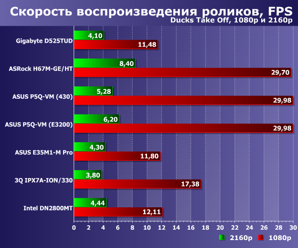 В качестве бонуса, чтобы платам с DXVA-декодером не было так скучно, мы добавили в тестовый забег ролик Ducks Take off в трех разрешениих: 1280×720, 1920×1080 (постоянный битрейт 108 Мбит/с) и 3840×2160 точек (постоянный битрейт 243 Мбит/с). Два последних ролика являются очень непростым испытанием даже для относительно мощной рабочей станции с современной дискретной видеокартой — посмотрим, смогут ли их воспроизвести старые и молодые компактные системы.