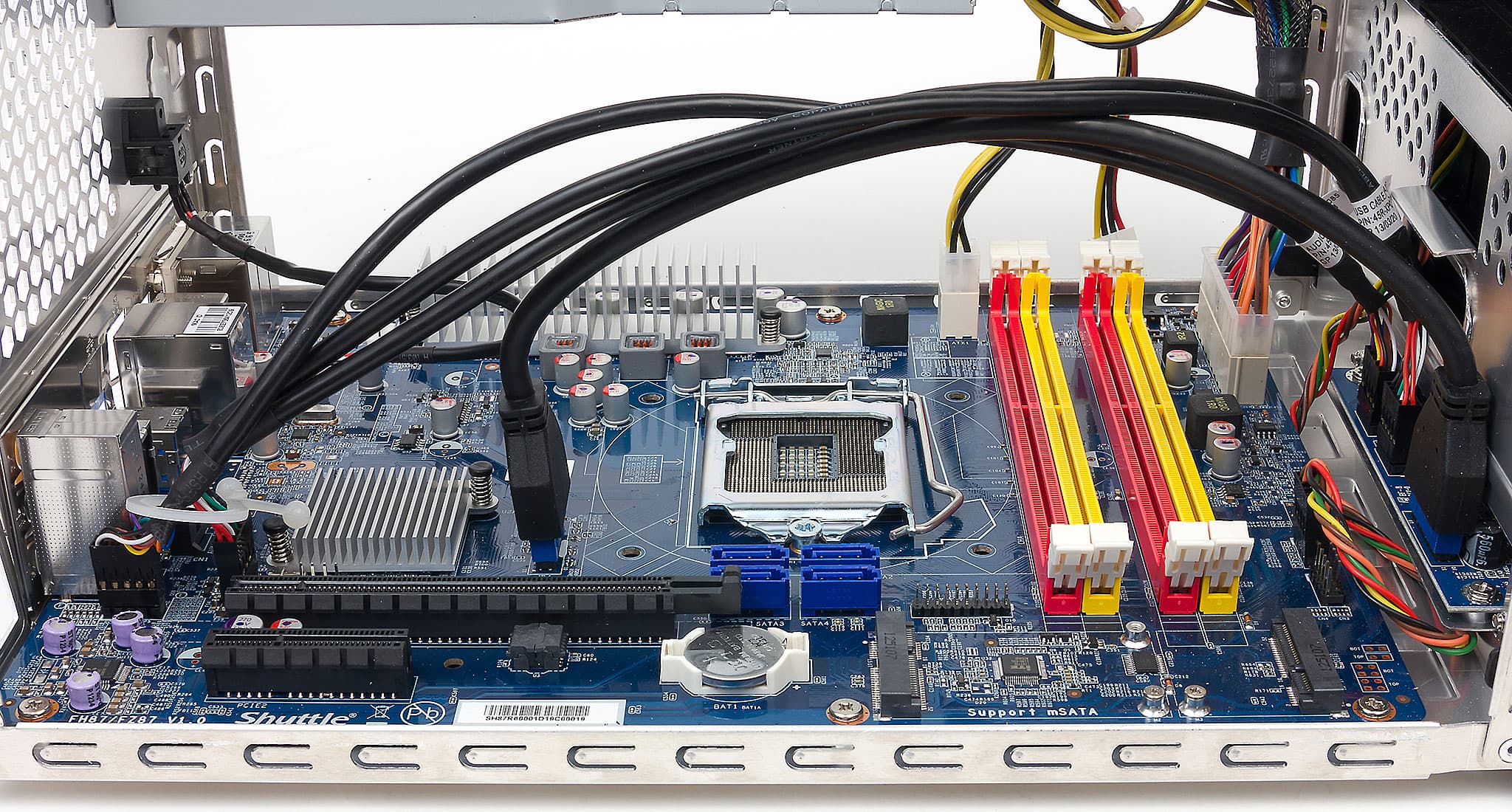 После снятия дисковой корзины и кулера мы обнаруживаем такое место, а заодно и все остальное, что есть на системной плате. Производится она самой Shuttle и имеет привычный для продуктов компании форм-фактор DTX — на один слот шире Mini-ITX. В результате на плате оказывается два слота PCIe — x16 и x1 (на фотографии виден х4, который был в предсерийных экземплярах), хотя использоваться будет лишь первый из них. Второй же перекроет система охлаждения видеокарты (с учетом сказанного выше — систему с интегрированной графикой можно собрать и в более компактном корпусе, так что видеокарта практически гарантирована), и бо́льшая ширина платы как раз и нужна для установки приличных карт с двухслотовой СО :) А для установки периферии можно воспользоваться двумя слотами Mini-PCIe, один из которых поддерживает и mSATA, так что, скорее всего, в большинстве случаев как раз и «уйдет» под SSD. Возможно, предполагается установка накопителя небольшой емкости, благо чипсет Н87 поддерживает Smart Response, хотя мы не считаем такой подход оптимальным — лучше уже купить SSD нормальной емкости и использовать его в качестве системного. Оставшиеся четыре (из шести поддерживаемых чипсетом) порта SATA600 расположены на плате в «обычном» формате, что даже несколько избыточно для трех поддерживаемых «по умолчанию» дисковых устройств. Но главное — что их достаточно. Так что систему можно легко укомплектовать SSD на 256 ГБ в формате mSATA (для системы и основного набора ПО), парой настольных винчестеров по 3-4 ТБ и DVD-писалкой: большее (да и такое же) количество накопителей ныне редко можно встретить и в полноразмерных корпусах, а в ноутбуках или мини-ПК оно просто в принципе невозможно.