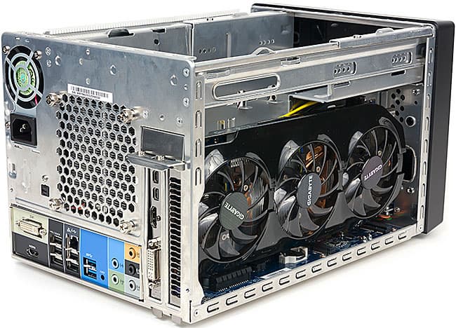 Игровое применение предполагает использование дискретной видеокарты, причем далеко не маломощной, что очевидным образом сказывается на размерах устройства: в отличие от привычных скелетов мини-ПК, шасси R6 имеет габаритные размеры 332×216×198 мм. В конечном итоге это дает объем в 14 литров, т. е. сюда уложатся аж 14 Foxconn NanoPC AT-7700 или 28 «нуков» (старых; новых — больше 30). Однако этот элегантный ящик все еще можно запаковать куда-нибудь в сумку и прихватить с собой на дачу, а по потенциальной производительности и емкости встроенных накопителей в сравнение с ним не идут никакие мини-ПК или ноутбуки. Таким образом, подтверждается правильность курса Shuttle: это уже не компактный компьютер современности (можно и меньше сделать), но вполне себе компактный игровой компьютер.