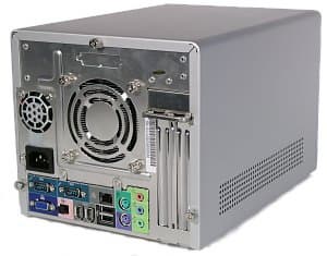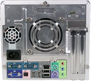 На задней панели располагается остальная и основная часть портов: 2 COM, 1 RJ-45, 2 USB 2.0, 2 Firewire, SPDIF In, VGA, 2 PS/2 (для клавиатуры и мыши) и стандартный набор аудиоразъемов, позволяющий осуществлять вывод 5.1-канального звука. Обращает на себя внимание тот факт, что, несмотря на концептуальную ориентированность устройства на будущее и наличие «продвинутых» возможностей, компания Shuttle и не подумала отказаться от COM-портов, не говоря уже про PS/2, в отличие от ABIT с ее семейством материнских плат MAX. Возвращаясь к задней панели SS51G, можно отметить наличие выходных отверстий двух вентиляторов и двух закрытых заглушками разъемов для карт расширения.