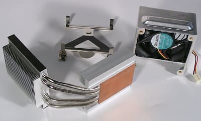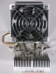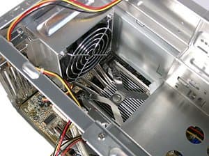 Вентилятор в системе охлаждения SS51G используется всего один, 80-миллиметровый, он выдувает из корпуса воздух, подсасываемый, как уже было замечено, через отверстия в боковых стенках крышки. Заодно вентилятор продувает удаляемым воздухом теплорассеивающие пластинки системы охлаждения процессора, основанной на технологии теплоотводящих трубок (heat pipes). Желающие могут подробнее изучить эту технологию в статье по приведенной ссылке, мы же отметим лишь «рабочие» моменты: радиатор с медной подложкой крепится на процессор и прижимается к нему с помощью клипсы, вентилятор крепится винтами на заднюю панель корпуса, прижимая к той же задней стенке верхний радиатор системы охлаждения.