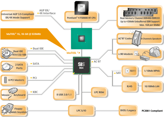 Отличия от SiS655 вполне ожидаемы: поддержка ускоренной процессорной шины (800 МГц) и новый южный мост. Вполне стандартно для FX-версий чипсетов SiS (эта компания последовательно и честно нумерует свои продукты), причем южный мост (что характерно для всех современных чипсетов) совместим по контактам со своими предшественниками и (вероятно) последователями. Функциональность SiS964 на сегодняшний день почти максимальна: количество портов USB 2.0 увеличено до 8, поддерживаются 2 порта SATA с функцией RAID (0, 1, JBOD) и прочие возможности, которые вы с легкостью обнаружите в описании любого чипсета. Отсутствует лишь контроллер FireWire (южные мосты с этой функцией у SiS «не пошли»).