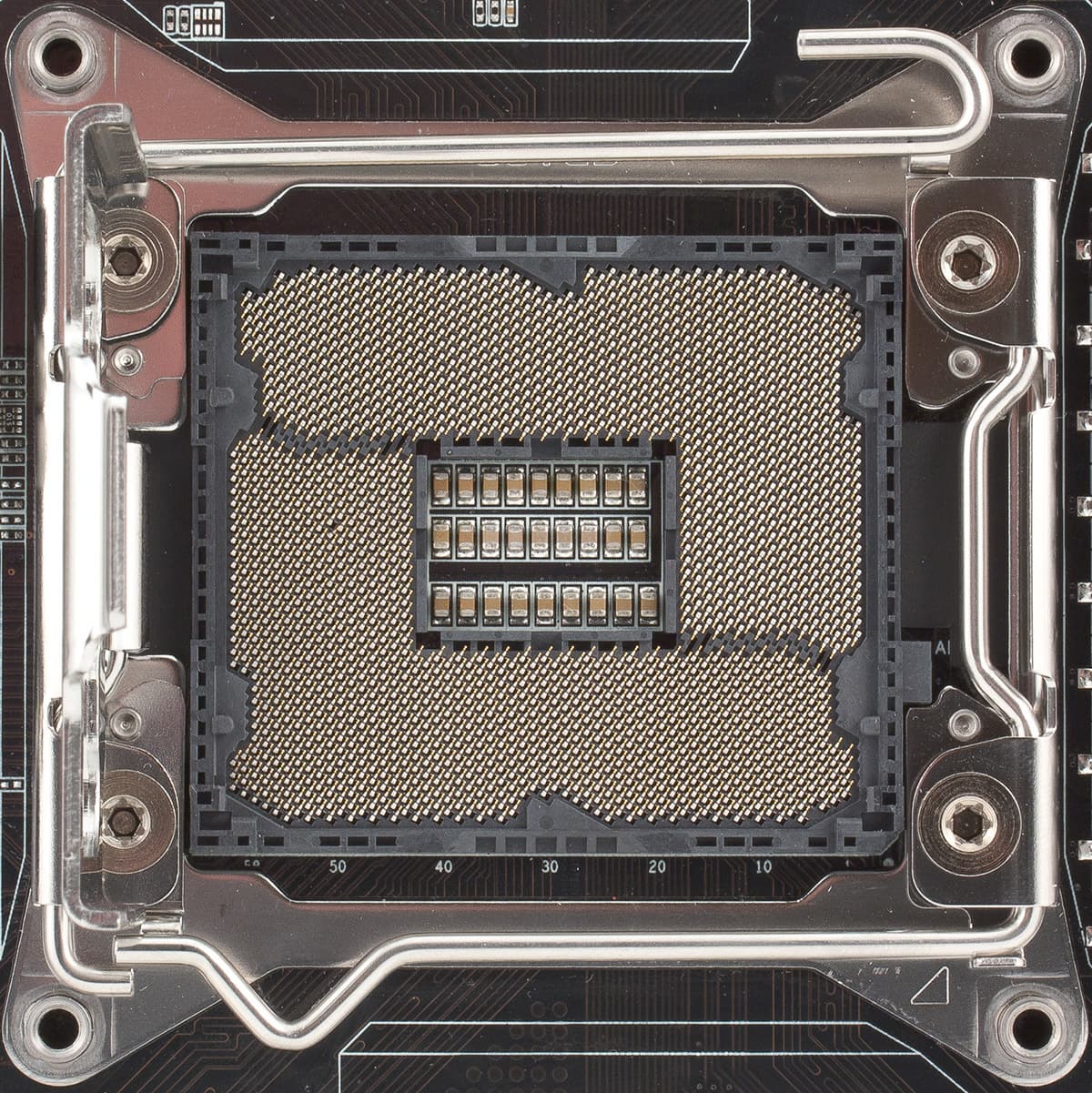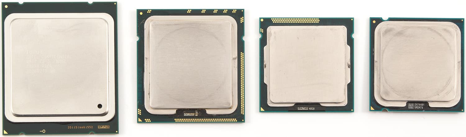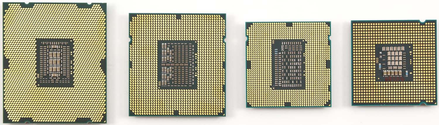 Количество «ножек» у новых процессоров (точнее, как раз у сокетов) выросло очень значительно в сравнении с любыми предшественниками. Конечно, тут сказались и четвертый канал памяти, и «лишние» линии PCI Express от процессора, но много и просто зарезервированных. Расположение ножек/контактов приобрело уже какие-то художественные черты, в массиве прослеживаются черты крыльев бабочки и чего угодно еще. Но если бы увеличение размеров печатной платы с контактами у процессора стало единственным изменением!..