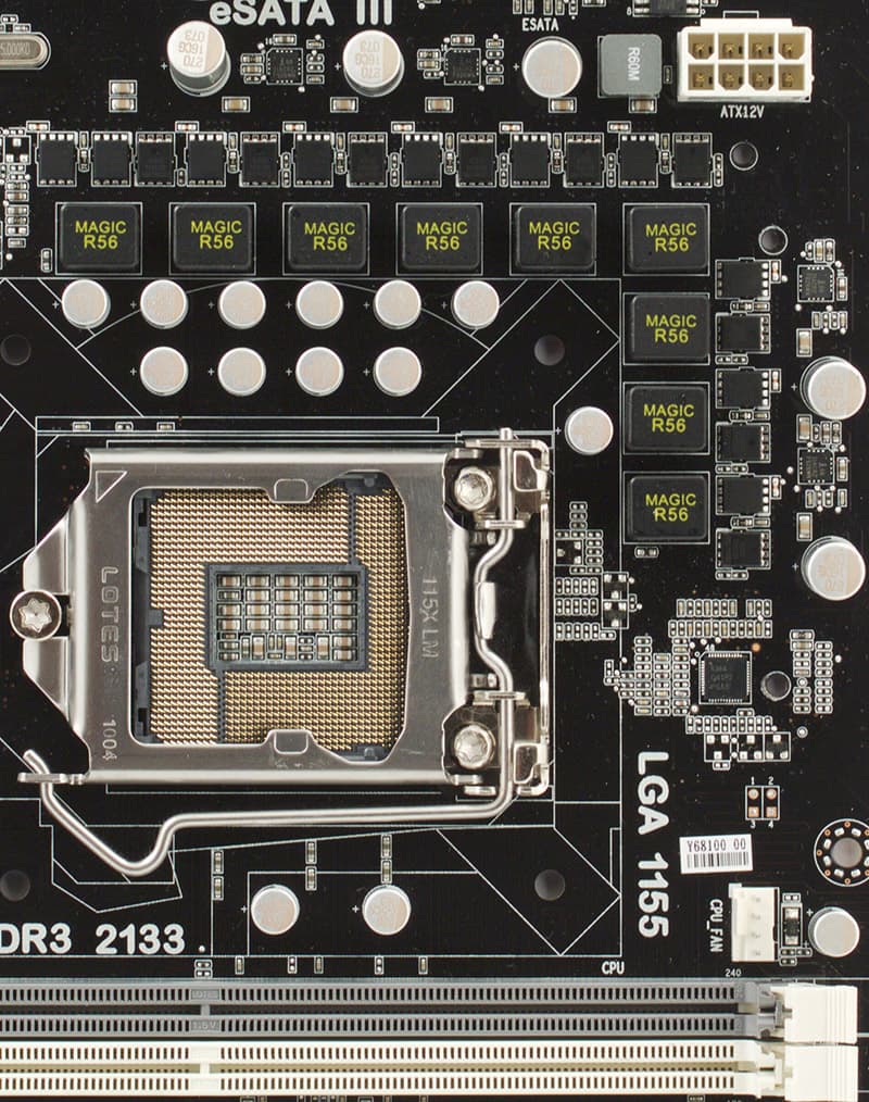 Это изменение в дизайне повлекло за собой и другое: раньше пространство между разъемами задней панели и процессорным сокетом было отдано под преобразователь питания процессора (обычно компоненты преобразователя огибали сокет буквой «Г»). В данном случае места у задней панели не осталось (там слоты двух каналов памяти), и преобразователь вынужден ютиться между сокетом и ближним к нему краем платы. Как следствие — производители резко перешли на использование компактных схем, и технология DrMOS, предложенная Intel еще 7 лет назад и долгое время применявшаяся лишь в платах MSI (мы о ней писали неоднократно), грозит теперь стать стандартом де-факто.