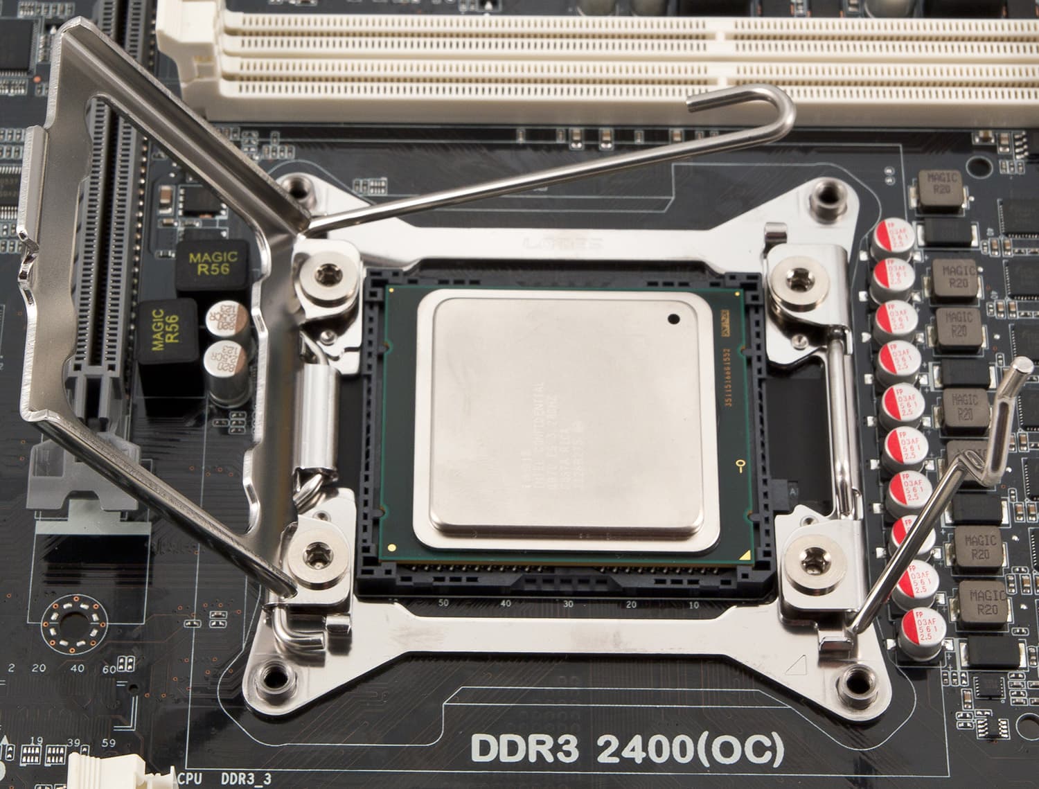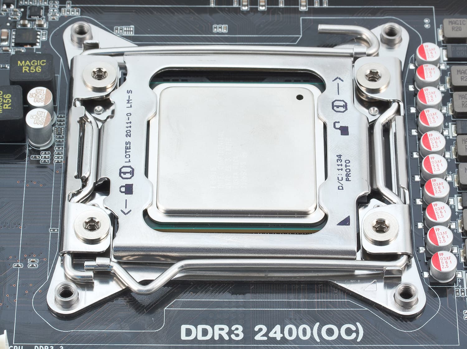 Новый сокет… впечатляет. На крышке специально для тупых нарисовано, в каких положениях за какой из двух рычагов браться первым, но, как и любая подобная псевдоинфографика, подписи эти зачастую только запутывают, и первое время приходится чертыхаться и пробовать. В общем идея в том, что сокет стал слишком велик, чтобы не перекосить крышку, прижимая ее лишь с одной стороны, так что теперь процессор «обжимается» сразу с двух сторон, боковые рычаги фиксируются по очереди. Проблем добавляет то, что конструкция замка совсем не жесткая, ощущается она даже как расхлябанная (хотя это продуманная свобода хода деталей), и в зависимости от взаимного расположения двух «половин» крепления их бывает невозможно застегнуть вовсе или же один из рычагов может цепляться не за свой упор, а за хвостовик второго рычага. В общем, тренируйтесь, владельцы новых плат.