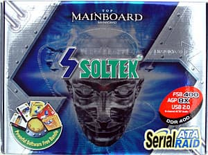Разводка платы не очень удобна (честно говоря, платы от Soltek с удобной разводкой нам встречались редко): разъемы IDE и FDD расположены позади слотов PCI, а звуковые разъемы — перед ними, также не лучшим образом для подключения расположен ряд разъемов вдоль левого края платы. Доступ к некоторым из имеющихся перемычек может быть затруднен при установке платы в корпус, краткое описание их функциональности приведено на текстолите платы. В двухканальном импульсном стабилизаторе напряжения питания процессора применены 6 конденсаторов по 2200 мкФ и 2 по 1500 мкФ. Также на плате находятся стабилизаторы напряжения шины AGP (включающий 3 конденсатора по 1000 мкФ) и памяти (3 по 1000 мкФ и несколько менее емких). Наличие напряжения +5 В индицируется красным светодиодом на плате. Разведены, но не распаяны на плате: разъем фронтальных аудиовыходов и сетевой PHY-контроллер. Размеры платы — 305х225 мм («зауженный ATX», крепление шестью винтами, передний край платы будет провисать без дополнительной фиксации).