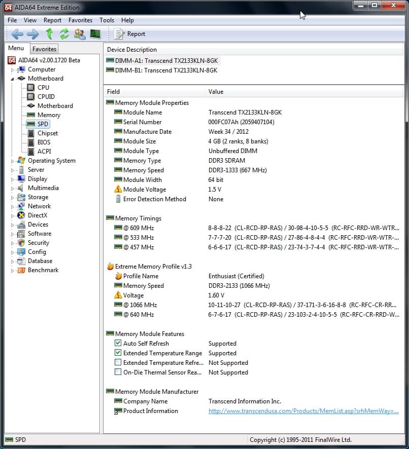 Модули поддерживают профиль XMP, прописаны режимы, которые производитель рекомендует для разгона, включая максимальную планку — DDR3-2133. Тайминги для такого режима должны составлять 10-11-10-27, напряжение на модулях — 1,60 В, а напряжение питания контроллера памяти в профиле не определено. Модули не побили рекордов в разгоне, но, тем не менее, поднять частоту относительно заявленной производителем удалось, хотя и только за счет небольшого разгона шины (до 105 МГц). Порадовало, что при этом практически не пришлось поступаться таймингами.