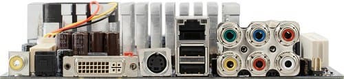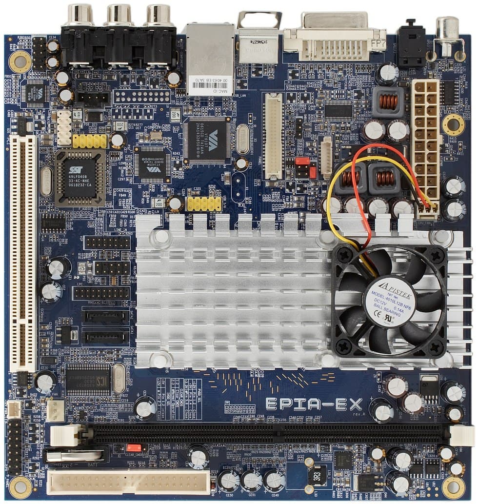 Дизайн платы в целом удачный, хотя вполне естественно, что маленькая плата, на которой установлено большое количество функциональных элементов и повсюду видны порты для подключения дополнительных разъемов, в полностью оснащенном состоянии неизбежно превращается в нечто с торчащими отовсюду шлейфами, так что об удобстве доступа к отдельным разъемам говорить не приходится. Впрочем, едва ли полное оснащение является типичным для подобных плат, а для встраиваемой системы или медиацентра удобство доступа к системной плате никогда не входило в число актуальных характеристик. На общем для процессора и чипсета радиаторе, имеющем более привычную форму и более скромные размеры по сравнению с решением от MSI, установлен небольшой вентилятор, работающий практически бесшумно; сам радиатор греется заметно меньше, кстати, версия VIA EPIA EX с процессором на 1 ГГц обходится пассивным кулером.
