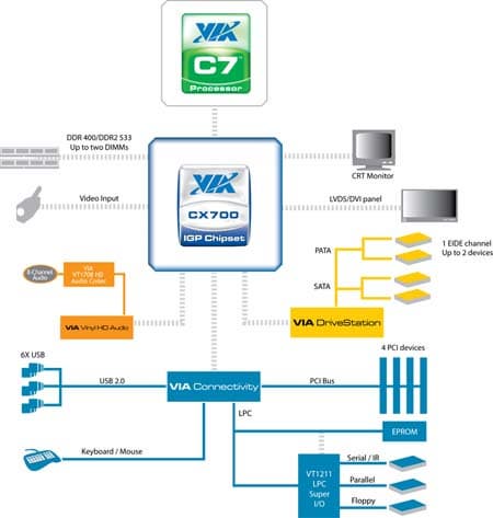 Как следует из официального позиционирования, в доме и офисе этой плате отводится роль основы для медиацентров, видеоплееров, компактных настольных компьютеров и подключаемых клиентских ПК с богатой мультимедийной функциональностью. Вполне широкая сфера. Мы уже рассматривали похожую по характеристикам плату MSI с интегрированным процессором VIA C7; основным конструктивным отличием в данном случае является одномостовый чипсет CX700. Давайте для начала посмотрим, как новое решение смотрится на фоне уже знакомой нам связки CN700 + VT8237A.