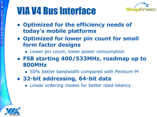 Однако в рекламных материалах VIA своей процессорной шины отнюдь не стыдится, считает ее оптимизированной для своих применений, и собирается лишь увеличивать частоту (вероятно, ко времени поддержки памяти DDR2-800), но будет ли локализовано и устранено явное узкое место — не известно, а до того, похоже, просто не имеет смысла устанавливать высокочастотные процессоры, так как прирост производительности оказывается крайне незначительным.