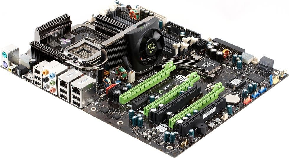 - 3 слота PCIEx16 для видеокарт: все они всегда работают со скоростью x16, причем два соответствуют второй версии стандарта PCI Express 2.0 (с пропорционально повышенной скоростью), возможна организация SLI на двух или трех картах;