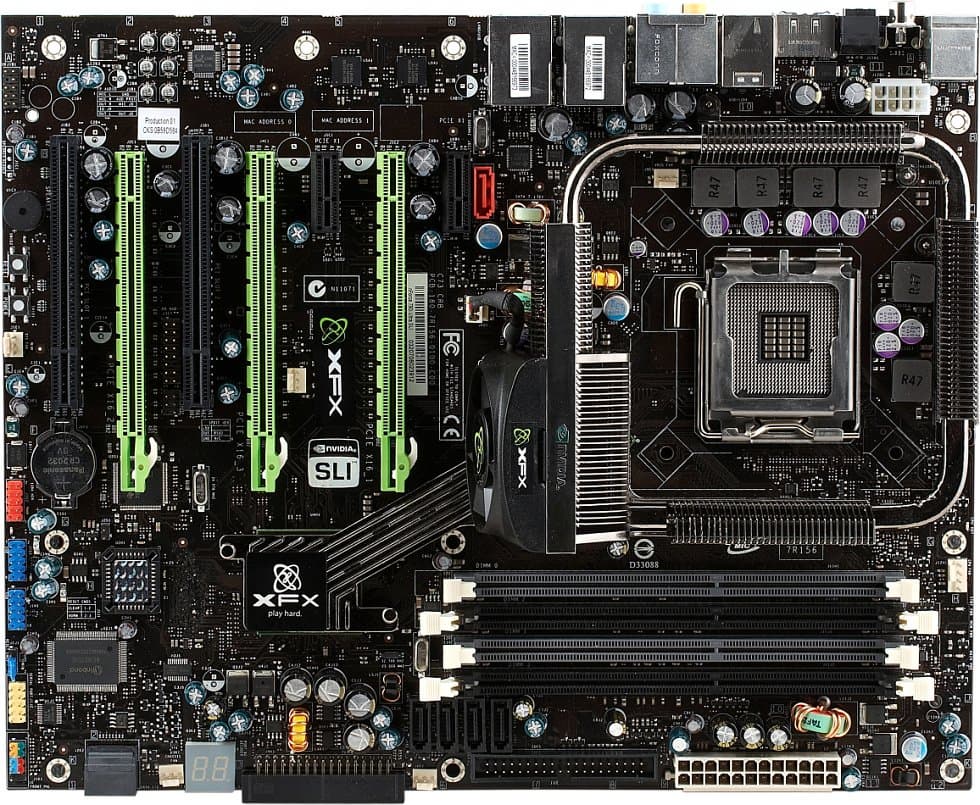 Плата имеет характерную для референсных моделей NVIDIA черно-зеленую раскраску и снабжена привычным набором особенностей топовых плат этой компании. Разводка не содержит крупных недостатков, которые мешали бы сборке системы, но и идеальной ее не назовешь: к минусам можно отнести расположение чипсетных разъемов SATA (кроме двух, напротив, удачно размещенных единым блоком, «уложенным набок»), разъема питания процессора, да и разъемы вдоль левого края платы далеко не всегда удобны для подключения коннекторов. Однако наибольшие сожаления вызывает набор слотов расширения: если количество PCIEx16 вполне объяснимо (с учетом позиционирования платы), то всего 2 PCI, причем при использовании SLI один будет недоступен — откровенно маловато. Ну и, конечно, отдельного разговора заслуживает система охлаждения чипсета.