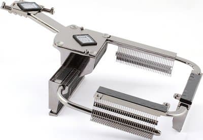 Чипсет очень горячий, так что на охлаждение брошены большие силы: помимо радиаторов на обоих мостах (правда, на южном радиатор крошечный) на плате установлены еще три, и все соединены между собой тепловыми трубками. Более того, хотя вентилятор на радиаторе северного моста не является, по мнению NVIDIA, обязательным, он идет в комплекте с платой и может быть легко установлен, что мы и рекомендуем сделать. Кстати, вентилятор (его можно прикрепить к радиатору только одной стороной) продуманно вытягивает воздух сквозь ребра радиатора, а не нагнетает его, удачно усиливая таким образом поток от процессорного кулера. Конечно, конструкция из нескольких радиаторов ограничивает набор подходящих процессорных кулеров, так как не все из них физически могут быть установлены в свободное пространство, но для большинства места будет достаточно. Кроме того (мы впервые наблюдаем подобный подход), чипсетная система охлаждения крепится к плате не при помощи пластиковых винтов-защелок, а полноценными винтами с обратной стороны. Таким образом, если у вас возникнет желание сменить или добавить термопасту под радиаторы (а возможно, и демонтировать комплектную систему целиком, заменив ее каким-то альтернативным решением), вам не придется сражаться с пластиковыми креплениями, которые, в большинстве случаев, выдерживают одну-две процедуры монтажа/демонтажа. Заодно появляется возможность увеличить прижимающее усилие радиатора к поверхности микросхем, хотя тут, конечно, главное не переборщить.