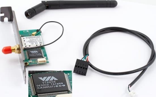 - Набор Wi-Fi-g (802.11b/g): планка на заднюю панель компьютера с контроллером VIA VT6656, кабель до разъема USB и внешняя антенна;