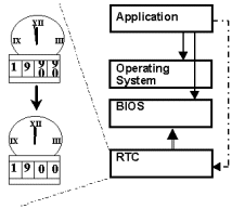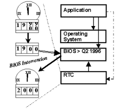 С точки зрения аппаратной части PC проблема 2000 года решается довольно просто. Если микросхема RTC не использует полный формат записи значения года, но при этом BIOS поддерживает запись в полном формате значения года и поддерживает переход из 1999 в 2000 год, то потребуется всего лишь единовременная коррекция даты. Все современные версии BIOS производят такую коррекцию автоматически.