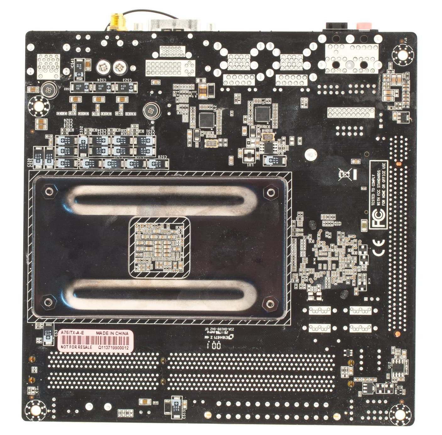 На обратной стороне платы в схеме питания процессора установлены 16 «танталовых» конденсаторов по 470 мкФ и 4 по 33 мкФ. Очень хорошая система питания, возможна установка любого из современных процессоров с разъемом FM1.