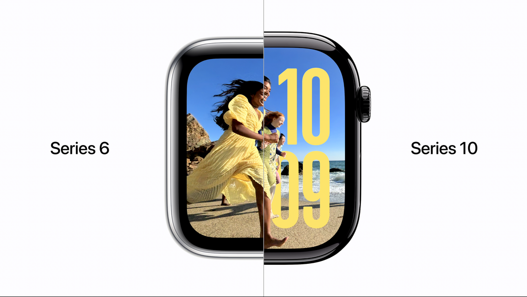 На одном из слайдов презентации было наглядно показано, как увеличился дисплей — правда, по сравнению не с предыдущими тремя поколениями, а с Series 6, когда экран был еще меньше, чем у Series 7 / 8 / 9. Любопытная маркетинговая уловка, не правда ли?
